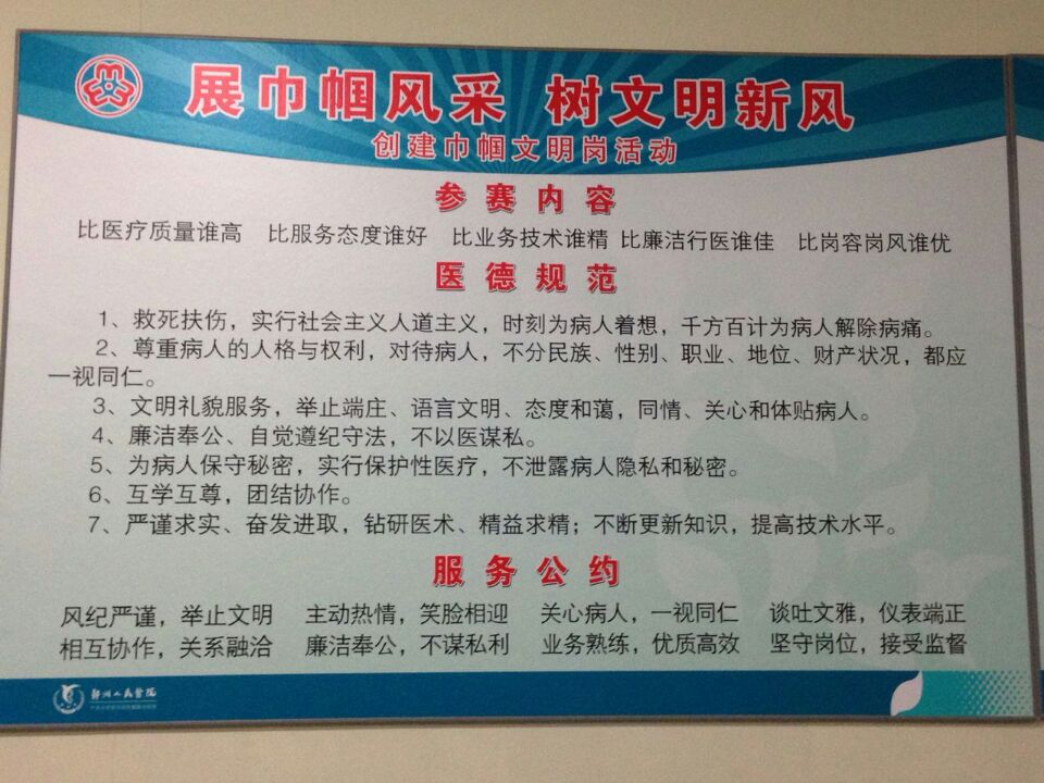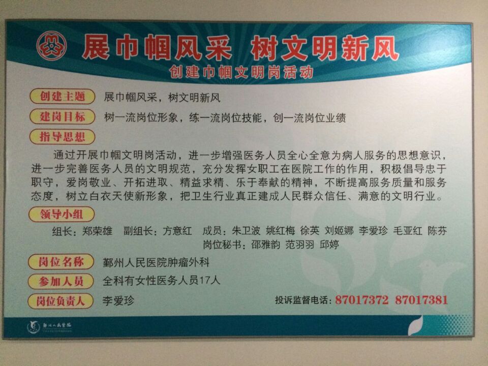 肿瘤外科因地方限制,把巾帼文明岗海报放在病人关注度最高的护士站前和医生办公室前。这样方便病人对我们巾帼文明岗岗位有更多了解。