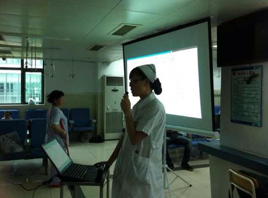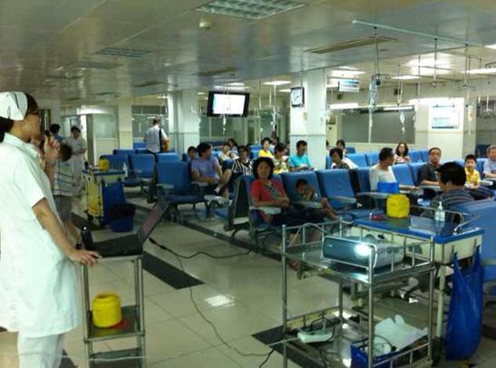 岗位成员在门诊输液大厅进行甲状腺疾病讲课的情境