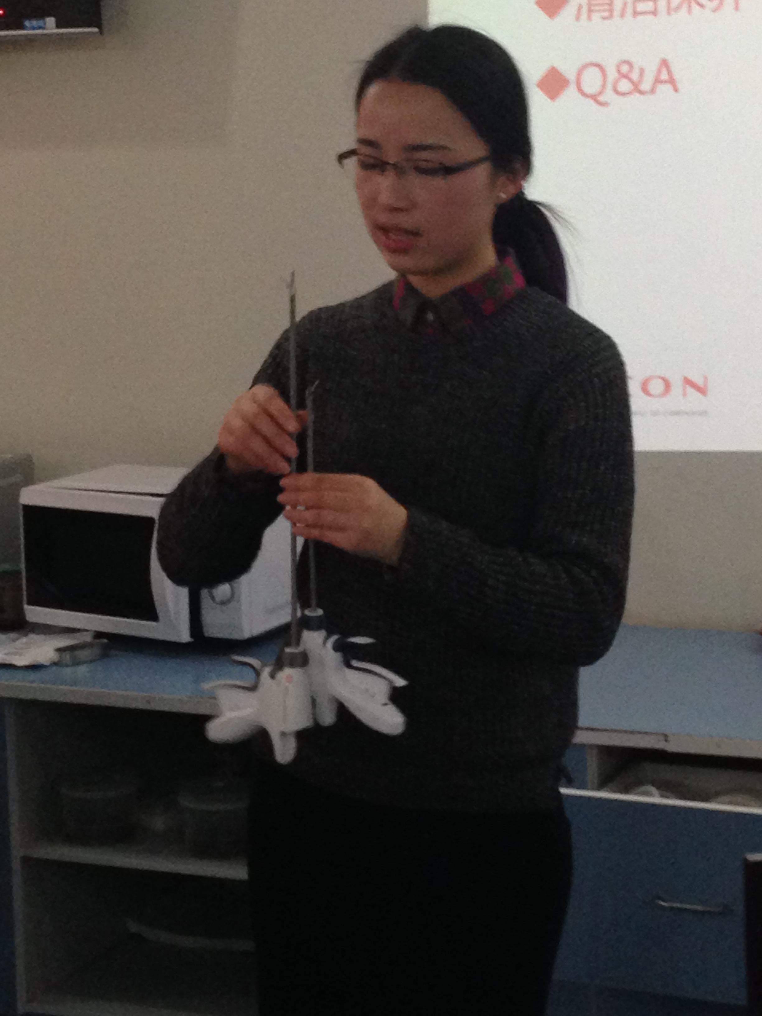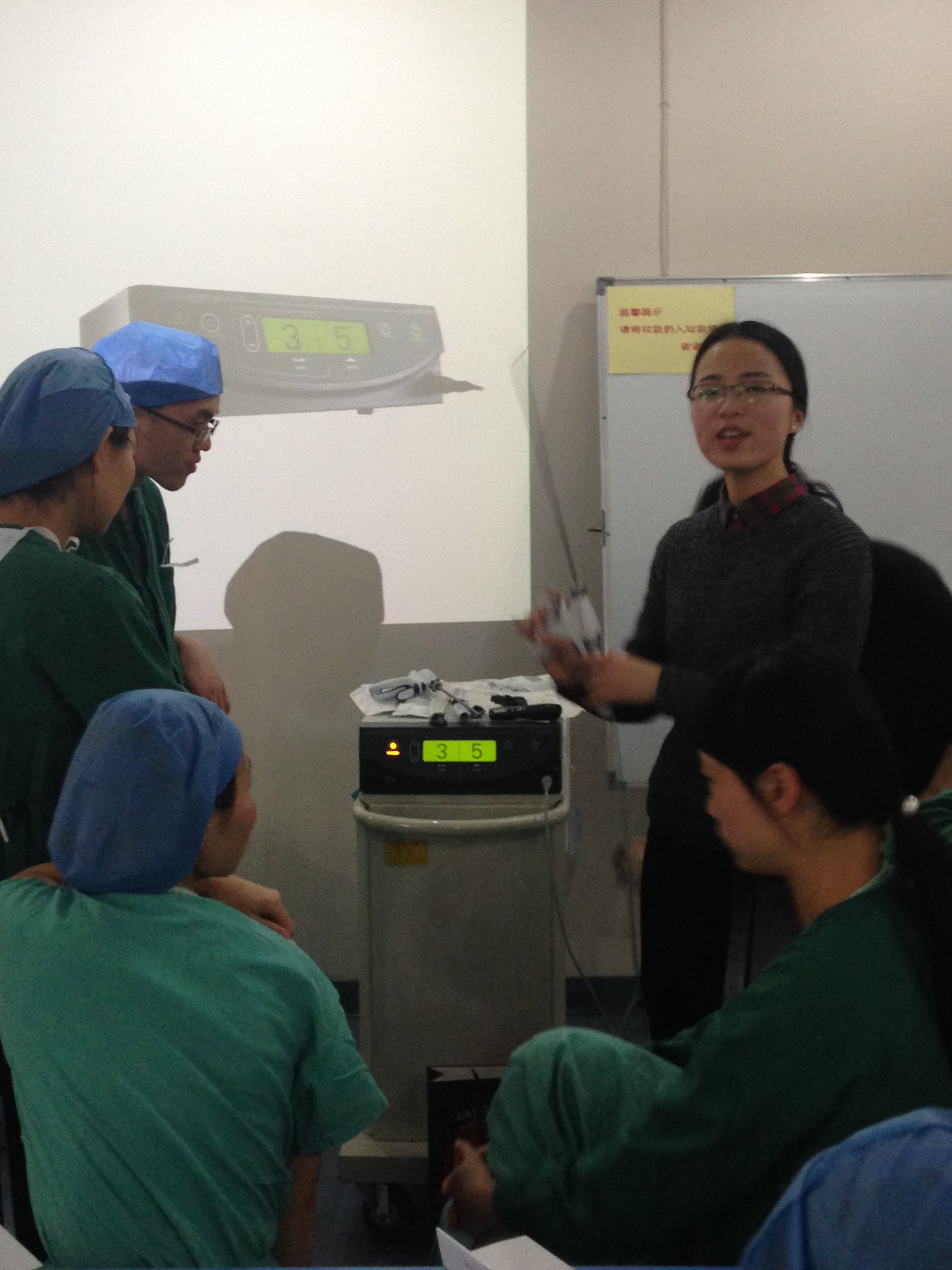 此次培训重点强调了超声刀的正确安装方法:手柄/刀头安装,将手柄插入主机,插电源、连脚踏、开机、STABDBY、手控,器械自检。注意事项有垂直握住手柄,将刀头对准手柄金属环;顺时针旋转杆身;握住手柄,顺时针旋转扭力扳手,直到听到两声“咔嗒”声;不要水平连接,手不能抓持刀头;使用每隔10—15分钟时,用湿纱布擦拭刀头;管腔内或刀片上擦不掉的组织可以用刀片刮或缝针挑;还可把刀头浸在水中踩脚档并轻轻抖动,震出腔内组织;实在去不掉可以用溶酶浸泡;主机离电外科设备1米远;扭力扳手定期更换,以保证刀头正确受力;定期请工程师维保。