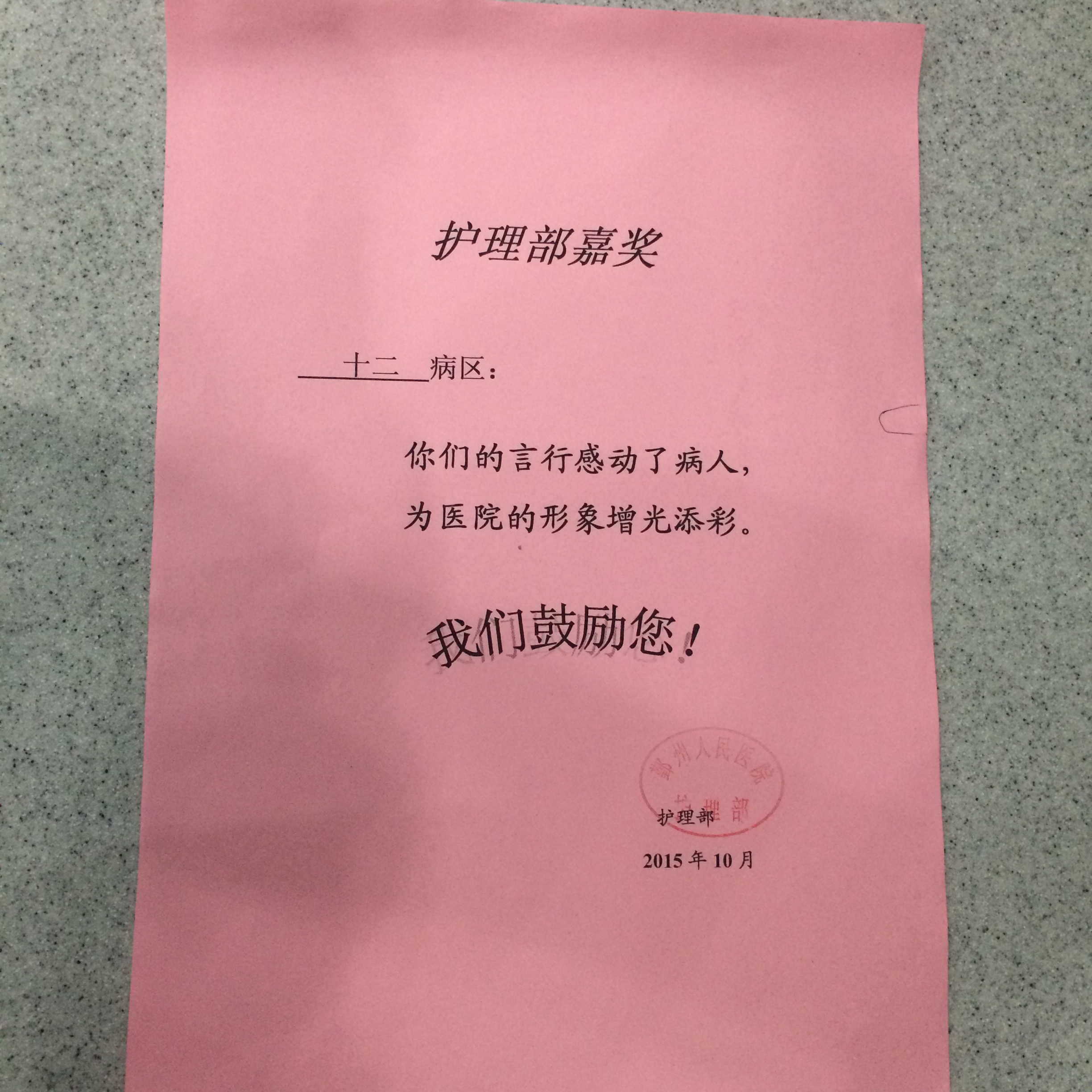 肿瘤外科巾帼文明岗在护理部十月份的病人满意度调查中获得病人及家属的一致好评,为此,护理部特加以表彰。虽然只是一张小小的奖状,但是为此我们肿瘤外科巾帼文明岗的所有成员付出了极大的努力,以全心全意为病人服务为宗旨,才能获得病人及家属的认可。当然,我们会继续努力,再创佳绩!
