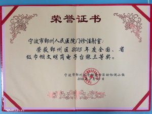 值得高兴的是在全区各级各类254个巾帼文明岗的电子书参比中,我院有两个科室获得荣誉,而我们门诊注射室获得了全国岗、省岗电子台账三等奖,这是对注射室的每位岗员最大的肯定,当然在接下来的一年里,我们一定更加努力,希望取得更好的成绩。