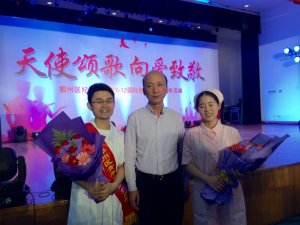 2016年4月29日,手术室巾帼文明岗岗员蒋江良参加由鄞州区卫计局和共青团鄞州区委共同举办的2016年鄞州区护理技能竞赛暨“青年岗位能手(护理)”技能大赛,荣获一等奖,并被授予“鄞州区青年岗位能手”称号,特此鼓励。鄞州区5.12护士节活动现场,陆勤康院长亲自出席颁奖典礼。下图为陆勤康院长与获奖选手合影。