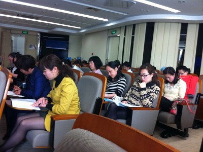 4月14日,2楼多功能厅传出朗朗读书声,这是医院窗口科室的员工正在接受普通话培训。为了使我们的员工不受工作时间的限制完成学习课程,特别邀请了鄞州区职教中心普通话培训老师陈圆来医院授课,并分别安排3个星期天来完成培训。陈圆老师是资深的普通话培训师,有多年的执教能力。她字正腔圆、认真细致的讲解使大家深受教益。学员们都专心学习,认真听讲,跟随老师的发声,从字、词、句来深究国语读音的规范:前鼻音、后鼻音、翘舌音、轻声、变调……一时间教室内平平仄仄、抑扬顿挫、书声朗朗。80后的员工普通话基础好,朗读大多规范标准,60后的员工也不示弱,反复琢磨。体检中心的何世国主任说:我们要笨鸟先飞,学得更加认真!