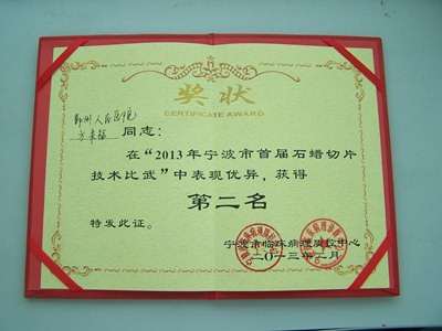 病理科方来福获“2013年宁波市首届石蜡切片技术比武”第二名