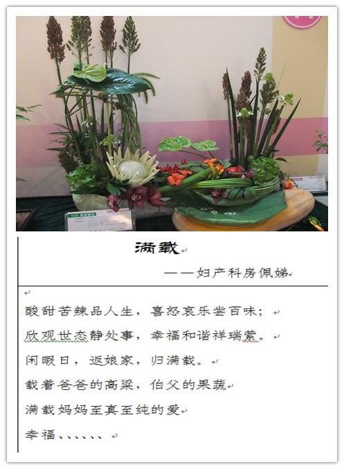 此次比赛共有38家单位152份作品,参赛四人一组,每位选手独立制作完成插花作品四份(果蔬插花、客厅插花、书房插花、小件插花)的其中一份。参赛作品都是现剪现插,比赛现场花香四溢,疏菜水果应有尽有,器皿也是琳琅满目陶瓷、漆器、铜器、黑陶、竹篮等,一盆盆插花,一高一矮、一直一斜,形式各异,内容丰富,寓意深厚,构思均衡完美,情趣倍增。活动现场人身鼎沸,路人纷纷驻足观看,拍照,选手们也互相欣赏着作品。妇联李主席和媒体记者经过我院参赛选手所做的作品前,对我们的作品特别是妇产科李学和的“小件插花”把职业与艺术插花的完美结合产生了浓厚兴趣,不停问作品的创作寓意,并夸奖作品的创意很好,值得称赞。经过评委们的认真评选,我院妇产科房佩娣的果疏插花作品“满载”、医务科陈旭维的书房插花作品“守拙”分获三等奖、药剂科的叶亚菊的客厅插花作品“热爱生命”获优秀奖。