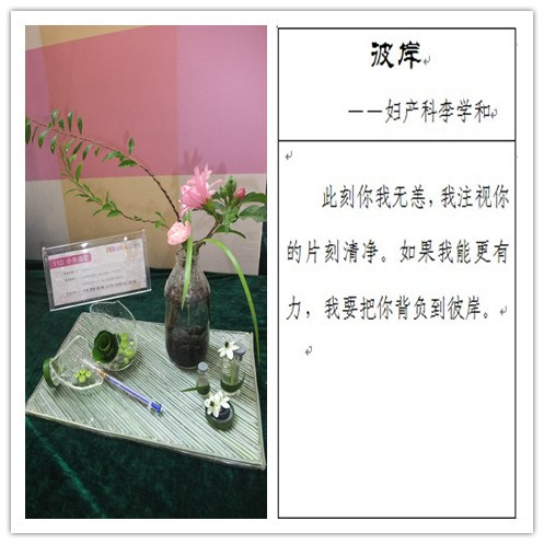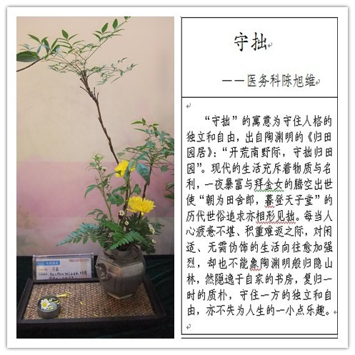 8月22日下午,我院职工房佩娣、严亚菊、陈旭维、李学和组成插花参赛组代表区卫生系统参加了由鄞州区妇联在万达广场举办的“花香溢鄞州·巾帼添姿彩”——女子插花大赛,参赛成果喜人,有三份作品获奖。