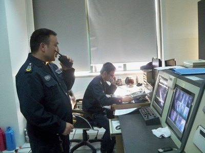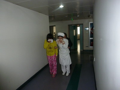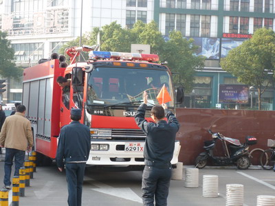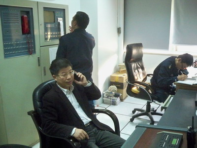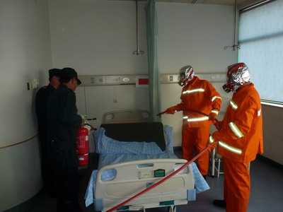 消控室的值班人员接报、复述、记录、汇报、全院红色9595紧急呼叫。消防总指挥快速启动全院性的消防应急机制。几秒钟完成抽调的义务消防人员冲向模拟火灾科室实施救援。尽管20楼医护人员在短短的5分钟时间里已完成了救援、灭火、阻隔、疏散等一连串的消防应急程序,义务消防人员到了火灾现场后还是飞速打开消防栓箱门拉水带、拧瞄子、开阀门、喷射 ,紧急疏散病人,进行警戒隔离等。同时还与江东消防中队就这次演练进行联演,因此南门卫有专门的引导保安挥小红旗引导消防中队救火车顺利驶入院内进行进一步的救援和灭火。