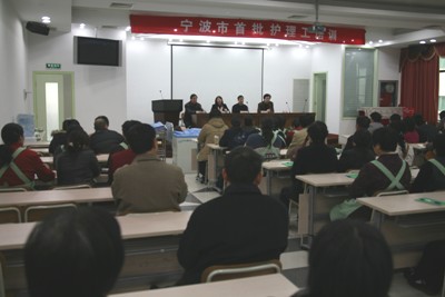 3月7日上午,宁波市首批护理工培训(由宁波晚报联合市劳动和社会保障局职业技能培训中心、鄞州人民医院举办)在我院门诊4楼学术报告厅正式开课。65名失业人员和外来务工人员成为我市护理工正规培训的首批学员。我院两位具有高级护师职称的张惠珠、陈玉兰老师为学员们上了第一课,讲授了有关内科疾病的护理知识与操作方法。