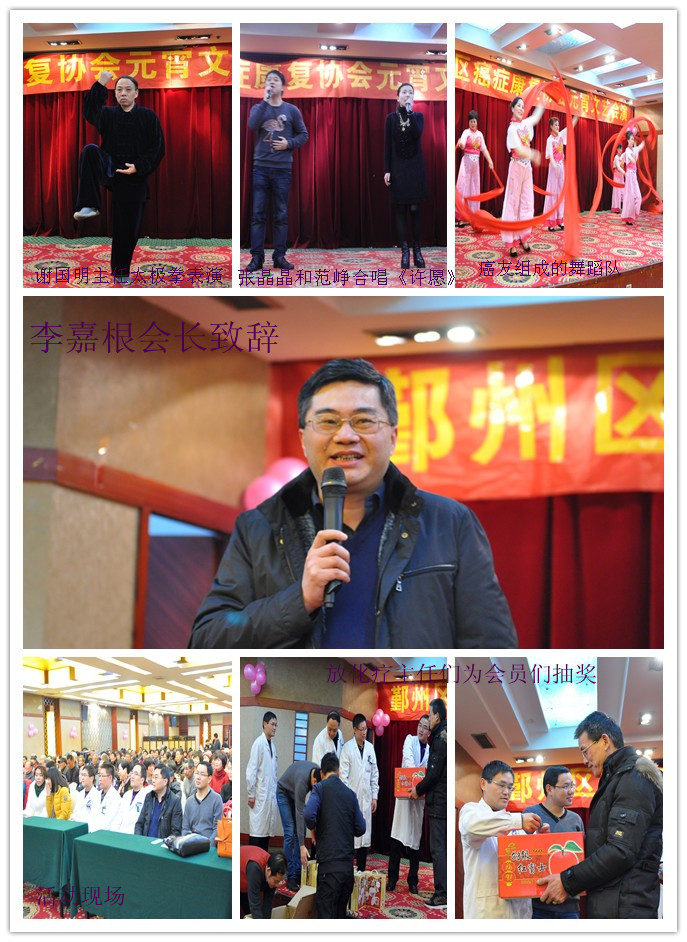 会上,副院长、也是鄞州区癌症康复协会会长李嘉根作了热情洋溢的贺词,并祝会员们在新的一年里身体健康,天天快乐!也感谢社会各界对会员们的关心和支持,并表示,将带领全体会员以积极的心态面对人生,感恩社会。接下来优美的舞蹈、美妙的歌声、魔术秀、游戏、猜灯谜等一项又一项的表演和趣味活动给广大会员们带来了全身心的愉悦。我院肝胆外科张晶晶和血液科范峥合唱的《许愿》、放化疗谢国明表演的《太极拳》鼓掌声此起彼伏,欢歌笑语声连成一片。