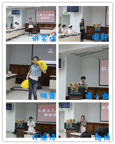 座谈结束后,义工们纷纷送上他们利用中午时间自编自导的节目,有舞蹈《傣家女》、手语表演《感恩的心》与《一起走》,还有京剧表演等,精彩不断。我院志愿者也为义工们展示了才艺表演,来自药房应靖雯的一支热辣舞蹈《少女时代》赢得了阵阵掌声,还有唱歌、讲笑话、朗诵及念打油诗等节目,一次次将联谊互动推向高潮。当天下午座谈联谊会持续近两个小时,由团委委员王建华主持。