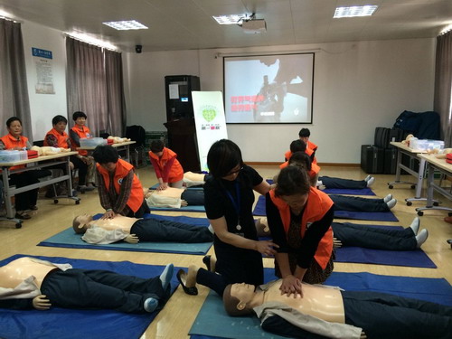 在培训中,培训中心主任孙宁奋为义工们现场模拟操作并讲解了遭遇突发事故的现场急救:如何在抢救的黄金时间给生命垂危的人做心肺复苏。大家体验了心肺复苏、人工呼吸的基本动作,并很快掌握了基本方法。现场气氛活跃,并受到了义工们的欢迎。
