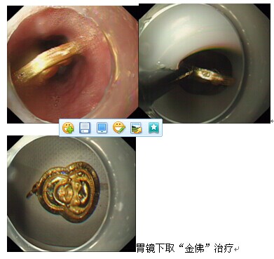 7月11日中午,消化科接到急诊科请求会诊电话,一名青年男子突发胸骨后疼痛伴胸闷气急症状急需会诊,许丰副主任闻讯后立即赶赴急诊科,经追问病史,患者因与家属“怄气”吞服了一枚金佛像,X片也提示金属异物嵌顿于食管。考虑到该异物随时会导致食管穿孔、感染和出血,危及患者生命,许主任决定必须立即对患者实施内镜下取异物术。经与患者家属沟通后,患者迅速被送到门诊六楼内镜中心。术中,许主任发现,患者食管下段嵌顿着一枚大小约3.5cm的金色异物,于是迅速采用异物钳将其取出。异物取出后一看,原来为一枚印有佛像的金制挂件,术后,患者难受症状立即缓解。