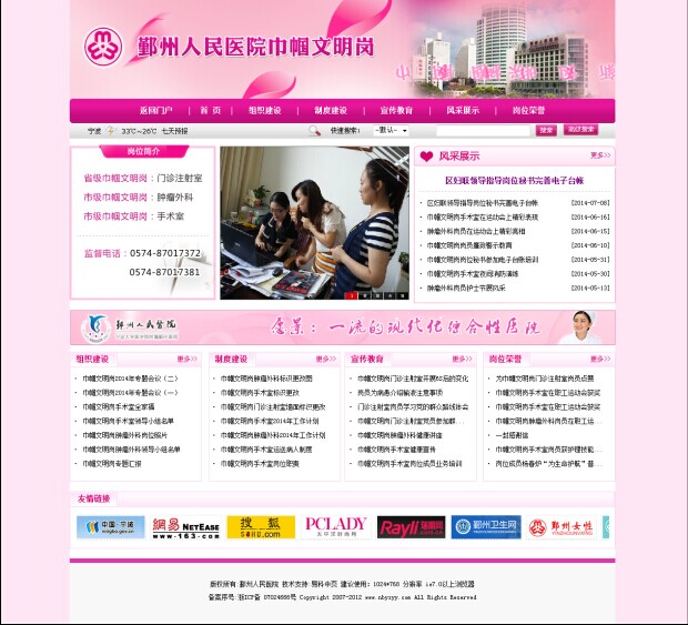 经过一段时间的努力,我院巾帼文明岗网页终于制作完成了。网页输入2013年至今的巾帼文明岗工作记录,鄞州区妇联和区卫生局妇委会领导看后给予了肯定,也鼓励我们再接再厉。在此我们也希望得到大家的关注和支持。