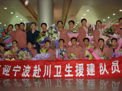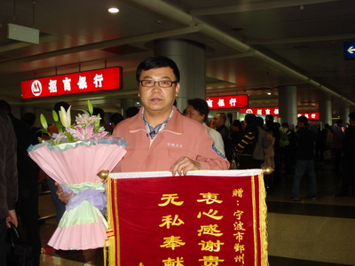 我院特检科医生颜宪书,顺利完成在四川省青川县乔庄镇卫生院的援建任务,于3月26日下午和第四批宁波市援建队员一同返甬。医务科陈雪琴科长代表医院到机场欢迎颜医生归来。颜医生自从去年12月23日赴川,在乔庄镇卫生院工作了三个月。这三个月是一年中最冷的季节,期间还有一个中国的传统节日春节。但是为了援建工作,他和其他队员一样克服了重重困难,牺牲了与家人的团聚,圆满地完成了任务。他的工作更受到当地百姓和同行的高度肯定,他们用写有“无私奉献、真情援建”的锦旗来感谢颜医生、感谢医院。