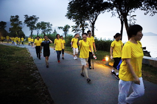 本次活动线路全长8公里,从启新高尔夫球场出发,沿湖走过韩岭、马山、小普陀、湖心堤,直到陶公村的小普陀景区停车场。沿途都是亲水路线,参与者一边欣赏东钱湖美丽的夜景,一边健步行进。