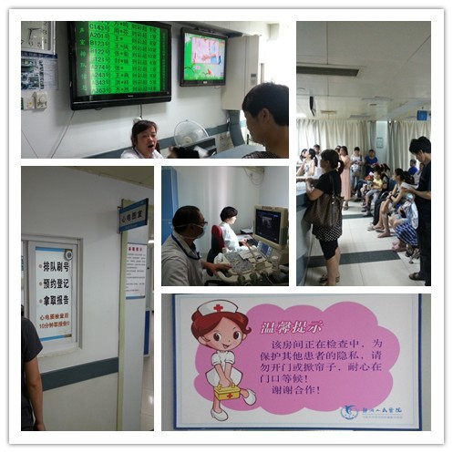原来我院“B超”操作诊室有8间,为了满足病友需求,尽可能减少病友排队等候时间,先后进行了扩展,还设置了电子排队叫号系统,目前已增至11间,就连主任办公室也腾出来做诊室了。如今“B超”预检平均每天叫号700余个,“B超”医生每人每天要检查约60到80个左右的病人。为了给病人一个好环境,医院还给每间每床都设置了保护隐私的隔帘。