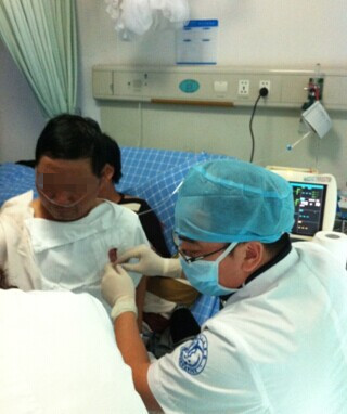 在病人及家属的要求下,病区徐正阳主任为了尽快帮病人减轻痛苦,连中午饭也没吃,在B超的引导下,帮病人完成了胸腔穿刺术,当引流出600ml胸水后,患者的胸闷症状明显缓解,疼痛也从9分降到了3分,王大叔可以半坐卧位躺在床上了。王大叔哽咽到:“徐主任,谢谢你!我终于可以躺下睡觉了。”