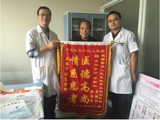 “邬医生您救了我的命啊,实在是太感谢了!不但顺利帮我完成了胃癌手术,还保全了我的肾功能。” 10月9日上午,专程从上海赶来宁波的张老伯,将写有“宁波医生不比上海差”几个烫金大字的锦旗送到医院甲乳腔镜外科邬颖杰主任手上,表达他对整个科室的感激之情。