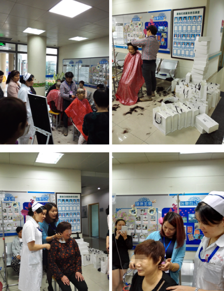 10月23日上午,经谢红艳护士长的联系后,汤氏假发的经理带着5位帅气的理发师和20顶精美假发走进了31病区。消息一经传开,31病区的病人们像过节一样,兴高采烈,不顾身上的疼痛,挂着化疗药的,打着三升袋的,插着胃管的,提着引流袋的病人纷纷从病房涌入大厅,大厅里顿时热闹非凡。病人们在护士长的安排下,一个个排好队,焦急的等待着。发型师根据个人的头型、脸型和肤色,为病人精心挑选一顶顶假发。每位患者在发型师的帮助下,戴上假发后都神采奕奕,让众人赞叹不已。等在后面的张阿姨既羡慕又焦急。
