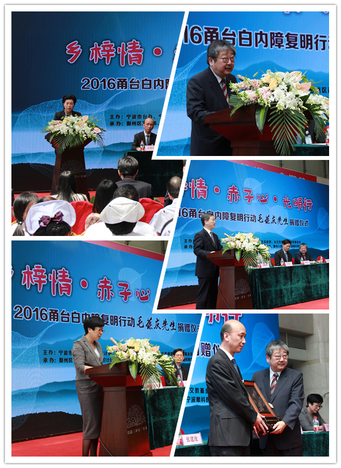 4月29日上午10点,2016年甬台白内障复明行动启动仪式在鄞州人民医院住院部一楼大厅举行。台北市博爱杰人会会长、中华捐血人协会副理事长、台湾爱盲协会理事长、台北市宁波同乡会前理事长、宁波市荣誉市民毛葆庆儿子毛家瑜、宁波市台办主任施金国、市卫计委副主任干爱玲、鄞州区副区长夏素贞等领导参加了这次启动仪式。