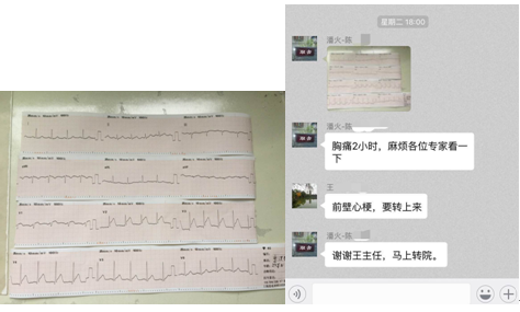 6月28日晚18时,潘火医院陈医生在鄞州区胸痛晕厥中心微信平台上发了一条心电图的信息,该患者为胸痛2小时就诊。我院心内科王春明主任迅速回应:考虑急性前壁心肌梗死。并建议立即转我院诊治。