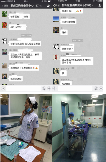 同时,在俞书记和王主任的协调下,整个胸痛中心开始运作起来:首诊医生予阿司匹林、波立维口服,并联系救护车转运,同时联系患者家属;心内科值班医生迅速通知急诊科准备接受病人,并立即赶到急诊科以节省会诊时间;通知介入医生及DSA护士立即到院术前准备。各个环节通过微信平台相互沟通、协调,迅速而有条不紊。
