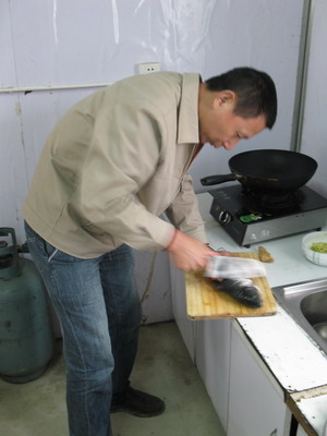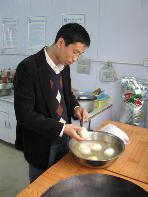 事后,有同事提了一个问题:当地震发生时,大家最想做什么,我觉着除了拉着身边的亲人、朋友、同事撒腿往外跑,我们还能做什么呢!!!当地震结束后,大伙纷纷选择给家人、朋友、同事述说这里发生的一切,而我选择了睡觉,我不想亲人、朋友们担心我的安全。同时也默默的祈祷,希望我们的援川生活安全、顺利、圆满的完成。(上图为三位男医生在烧拿手菜)