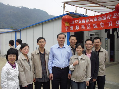 2009年10月23号,一个秋高气爽的下午,我们援川医疗队迎接了一批特殊的客人。鄞州区卫生局孙鸿副局长、鄞州人民医院潘亚梁院长及其他相关部门的领导等一行在宁波市卫生局干爱玲副局长的带领下,带着宁波人民的深情厚意和宁波卫生人的殷切期望,风尘仆仆地来到了我们青川县乔庄镇---宁波卫生援建对口单位。在青川县梁义兮副县长和卫生局王德君局长、宁波市援建指挥部领导的陪同下,亲切看望和慰问了我们宁波市(鄞州区)第七批援川医疗队全体队员,与我们亲切交谈,并勉励援川医疗队员发扬不怕苦,不怕累,不怕脏,不怕艰辛的精神,为青川人民的身体健康保驾护航,为宁波卫生系统争光,圆满完成医疗援川任务。