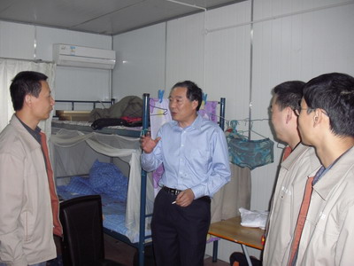 我们鄞州人民医院的五位白衣天使们早就得知我们的潘亚梁院长、谢祖宏副科长以及精神科陈小珍医生会一起来看望我们,大家早早的就等在驻地路口,潘院长一行人一下车,就被我们热情的包围,我们带着他们参观了我们的集体宿舍,潘院长一边关切的询问了我们的生活、工作、学习以及思想情绪的变化,一边转达了他以及全院职工的慰问,并代表医院为我们送上了慰问品。他首先嘱咐我们要注意自身安全;其次生活上要互相帮助,工作上要发扬鄞医人的精神,展示我们良好的综合素质,不仅代表鄞医,也代表区、市及省卫生系统,为鄞州争光,为宁波添彩,最后对我们的工作也提出了更高的要求,在保证医疗安全的前提下,争取多做青川县乃至广元市的NO1病例,我们几个也向潘院长表态,将以良好的精神面貌,认真负责的工作态度,打下具有鄞州卫生医疗队伍的品牌。由于时间紧迫,会后大家纷纷和潘院长、谢祖宏科长合影,晚上潘院长、谢副科长不顾长途跋涉的劳累,还和我们一起载歌载舞,这是我们在青川过的最幸福的一天。