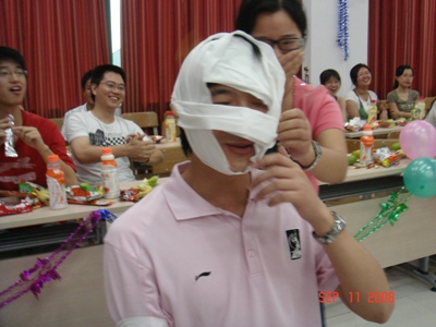 场景二:抢救伤员:每一组,一个人做医生,另一人做伤员,主持人说伤员哪个部位受伤了,那个“医生”就给伤员包扎那受伤的部位,结果经多处受伤的“伤员”,被“医生”包扎后,成了一经典的艺术作品,那些“艺术作品”还在场上秀了秀,这只能把大家逗乐再逗乐,除了前俯也就只能是后仰了。
