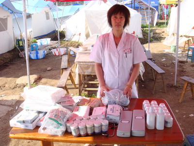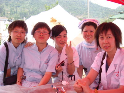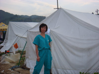 我院妇产科副主任胡亚飞医生于6月26日出发,随同浙江省宁波市援川的医务工作者,在青川县木鱼镇卫生院开展工作。在木鱼镇,她每天工作和生活的地方都是在帐篷里,白天的温度高达40度以上,工作起来经常是满身汗水;晚上却很冷,甚至要盖棉被。尽管条件十分艰苦,但是短短十天内,胡亚飞医生完成人流手术16例,取放环20个,在帐篷中诊疗门诊病人达250余人次,抢救中毒病人1例,检查临产妇1人(后转至县人民医院生产)。在此期间,她还参加了由省卫生厅组织的现场办公会议,并前往木鱼镇中学凭吊逝去的289名学生。