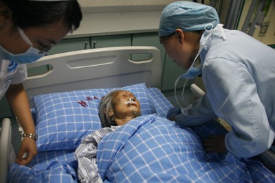 5月28日晚,第二批送来我院的12名四川地震伤病员中,有一名90岁的高龄老太太神志不清,烦躁不安,医生第一时间给予了详细的体格检查和紧急的救治后,送ICU进行重症监护。副院长裴仁治说:“病人年龄大,病情危重,又没有家属在旁,我们会给予她最好的救治和最细心的照顾,希望老太太能平安度过危险期,早日康复!”