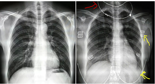 我们看看第二张,这是没有脱胸罩照的。对比第一张,我们看到红色箭头的是戴在脖子上的项链,黄色箭头指的是胸罩的扣子和钢圈。这些体外的异物跟我们要观察的骨头和肺重叠了,如果刚好这些部位有病灶,这些体外的异物就会遮挡了病灶,导致漏诊及误诊。