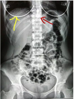 再看看图三,这是一个立位腹部平片,用老百姓的话就是拍肚子的X光片子。那么肚子部分的有金属的东西都必须拿掉(比如裤子的裤链,扣子,外面裤子就需要往下脱了),但是拍肚子的时候要包括部分的下胸部,我们可以看到片子上黄色箭头指的是胸罩的钢圈,红色箭头指的就是后面的扣子。这个时候扣子就跟胸椎重叠了,如果这个骨头有事,有可能就看不出来了,就是导致了漏诊。