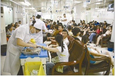 据该院急诊科副主任应仲良介绍,连续几天,晚上前来看急诊的病人猛增,增加幅度约在三成左右,其中感冒、发烧、腹泻、中暑等病人特别多,各个年龄层都有,包括不少小孩子。有一些腹泻严重的病人,已经出现脱水、血压降低等现象,需要入院治疗。据医院方面介绍,近期以来,输液室护士增加了8名,在晚上还加了两个班次。