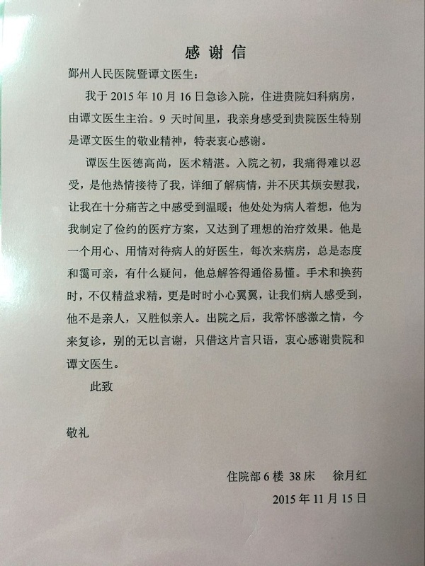 亲身感受到贵院医师的敬业精神,特表衷心感谢!