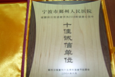 日前,在鄞州日报举办的“十佳诚信单位”评选中,我院榜上有名。这是读者根据自己体会投票选出的,是对我院工作的热情肯定,更是医院不断提高服务质量,积极塑造诚信形象收获的硕果。近年来,医院本着“人为本,诚犹信,技求精,业缘新“的文化建设宗旨,加强各项医疗服务建设,努力做好诚信服务,不但赢得病友的信任,取得较高的满意度,更是在重大任务中(如抗震救灾)表现出了良好的工作风范。然而,服务没有终点,医院继续将查找细节,规范服务,培养意识,树立形象作为文化建设的重点,不断推陈出新,创新工作,温馨服务,诚信为民!