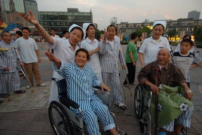 今天下午(7月1日),第2批10名震区伤员即将出院返乡。临行前,医院领导商量决定让同胞走出医院,体会一下不一样的宁波人文气息,看看不一样的爱心城市景色。为了照顾好他们,让他们愉快安全出行,昨晚院部和病区医护人员作了精心的组织和安排。医生和护士们的心情也和震区同胞一样激动,一边讲解着,一边搀扶着,如同儿女陪伴着亲人,为了让老病友看得更清楚,病区主任谢祖宏甚至还把他背了起来。开心的笑容荡漾在每个同胞的脸上,为了让他们微笑,为了让他们坚强,为了让他们从病痛中走出来,医院上上下下自始至终地努力着……爱一直在每个人心底延续……