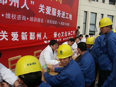 来自安徽的25岁建筑工人小马说:“我终于知道自己为什么老是觉得左肩发酸了。在工地就能看病,不用误工,真方便!”“你这是腰肌劳损,来,我给你贴张膏药!”“你有家属在工地吗?这些避孕药具送给你。”今日,我院行政党支部和天使志愿者服务队组织十余名专家,参加共青团鄞州区委主办的新鄞州人关爱工程系列活动进入建筑工地,为数百名建筑工人进行内科、外科、眼科等科义诊,并送去了常用药品、药具。此外还安排了测量血压、急救知识解答、健康咨询等,对农民工工作生活中的健康知识、疾病治疗常识进行宣讲,这些项目受到了工人们的一致欢迎和好评。这次爱心义诊进工地活动,使数百名工人都对自己的身体状况有了科学的了解。据了解,外来务工人员健康状况远低于城市市民的平均水平。外来务工人员的健康问题,应以引起全社会的关注,作为公益性医院,我们责无旁贷。今后,我们还将不定期开展为农民工送健康的活动,走进更多建筑工地义诊、咨询,深入一线把健康送到更多农民工的身边。