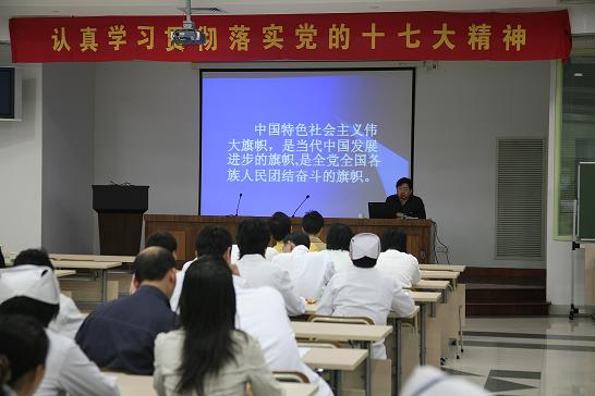 11月1日,全体党员和中层干部在学术报告厅聆听了区委党校郑继伟老师关于对十七大报告解读的讲座。通过学习,大家纷纷表示一定要结合医疗卫生工作实际,认真学习、深刻领会、全面把握精神实质,加强医德医风建设,提高医疗服务质量,在实际岗位上努力为人民群众提供安全、有效、方便、价廉的医疗卫生服务。努力构建和谐医患关系,确保医院又好又快发展。