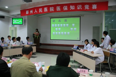 此次比赛得到上级领导和院领导及全院各科的高度重视和支持,宁波市劳动局医保处处长王海潜、鄞州区医保中心主任朱叶峰等市区医保部门的五位领导及分管院长陆勤康、党委副书记郑荣雄出席了竞赛并兼任评委。由全院各大科组成的七个代表队参加了比赛,比赛现场紧张而有序,现场气氛非常热烈。参赛选手和智囊团成员个个胸有成竹、镇定自若,面对提问,对答如流,博得了观众阵阵掌声。在观众互动环节,现场的气氛达到了高潮,台下观众都踊跃地举手积极回答问题,每个答对的观众得到了一份精美的奖品。
