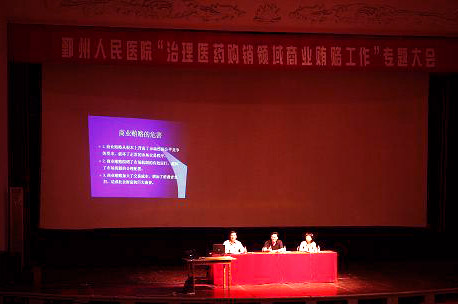 6月13日晚6点. 我院在凤凰剧院召开了关于治理医药购销领域商业贿赂专项工作动员大会.会上院长、党委书记潘亚梁进行了动员.要求全院职工增强紧迫感和责任感.树立大局观念和法律观念.廉洁工作.真诚服务.维护医院的良好形象。接着区卫生局毕校龙副局长还为全院职工进行了题为《向商业贿赂宣战》的专题讲座。通过一些典型案例.陈述了商业贿赂的危害以及专项整治的重点,要求大家消除侥幸心理和法不责众的心理.自觉抵制商业贿赂。
