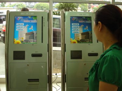 早在上周,我院门诊大厅就已经摆上了5台簇新的专用付费挂号机,首页是“普通门诊”、“专家门诊”、“急诊门诊”、“自助付费”、“余额查询”选项。患者只要通过简单的触摸点击选择相应功能菜单、按照系统提示即可浏览门诊的排班和专家信息、选择相应科室进行挂号;刷卡后根据卡内处方信息实现收费;打印相应凭据功能。其中两台用于自助挂号,两台用于自助收费,一台用于打印条码。这五台机器分工协作,充当了5名虚拟的挂号收费人员,相当于增开了5个快捷窗口。