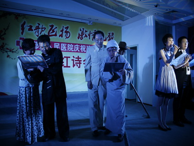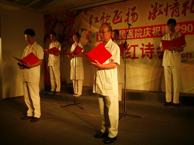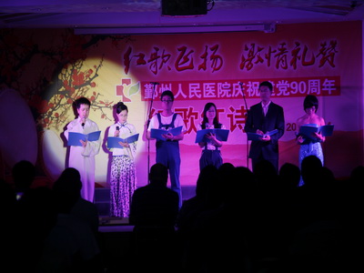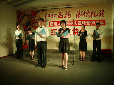 6月14日下午,由院党委主办的“红歌飞扬,激情礼赞”庆祝建党90周年红歌红诗会在门诊四楼学术报告厅隆重举行。党委书记、院长翁国斌、副院长裴仁治、俞万钧、党委副书记郑荣雄等领导出席了此次比赛并担任评委,另外宁波市合唱协会常务理事、宁波市歌唱家协会会员吴蔚老师担任大赛评委,更为比赛增添了色彩。翁院长的讲话拉开了比赛的序幕。