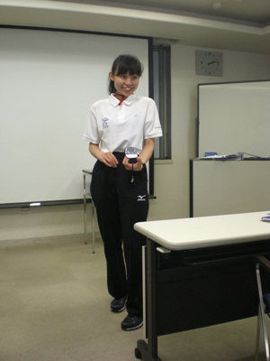 “健康日本21”建议每日步行10000步左右,像我的话要走6公里左右。怎么算,用计步器(pedometer),我们一来到爱知健康中心,每个人就发了一个计步器。记录每天行走的步数,如下图,这是我们的教练,展示计步器。