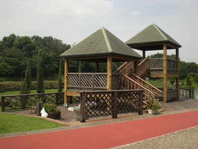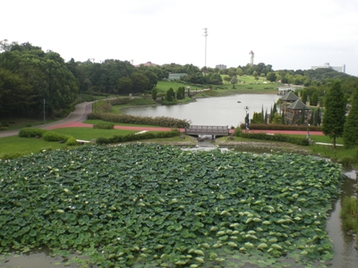 中心旁边就是爱知健康森林公园,风景很好,公园中心是个大池塘,池塘里种了很多荷花,目前正值荷花盛开,池塘旁边是1.1公里的塑胶跑道,只要天气好,从早到晚,到这里来锻炼的人络绎不绝,大多数人选择疾步走,也有少数人选择慢跑。