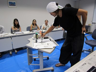 有一天傍晚我从实验室回来,听说JICA中心开了一堂日本书法课,匆匆扒了几口饭便背着书包冲进了教室,却被老师婉言拒绝,说上课需要预约,因为笔墨纸砚有限,每人一副,并无多余,我便虚心答道,不写亦无妨,让我旁观聆听足矣。行家一出手,便知有没有,我就是想看看日本书法的独到之处。结果逾时一刻钟,尚有三分之一的学员未到,分头打电话去询问,均表示放弃,于是我这个替补才得以上场。