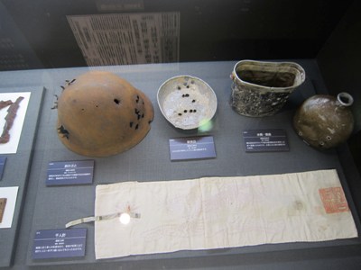 前线日军如何“英勇作战”“奋勇杀敌”也被当做正义之举大肆宣扬,他们生前的头盔水壶弹孔嶙嶙,血迹斑斑,告示着那些“穷凶极恶”的“敌人”真是太可恶了。