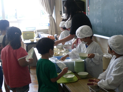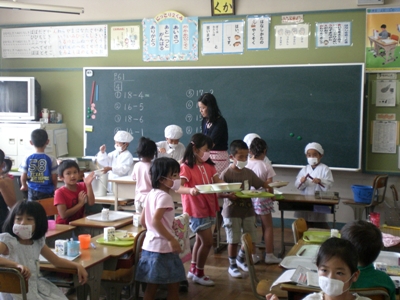 日本小学也有6个年级,每天午餐饭菜种类是一样的,就是量略有所不同,年级高的小学生量就多一些。每天到了开饭的时候,小学生轮流当小厨师给其他同学盛饭菜。