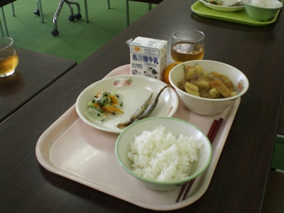 我们每个人掏了220日元,也享受了这样的一顿午餐。小学六年级的量,还多给了我们一条鱼和一杯茶。